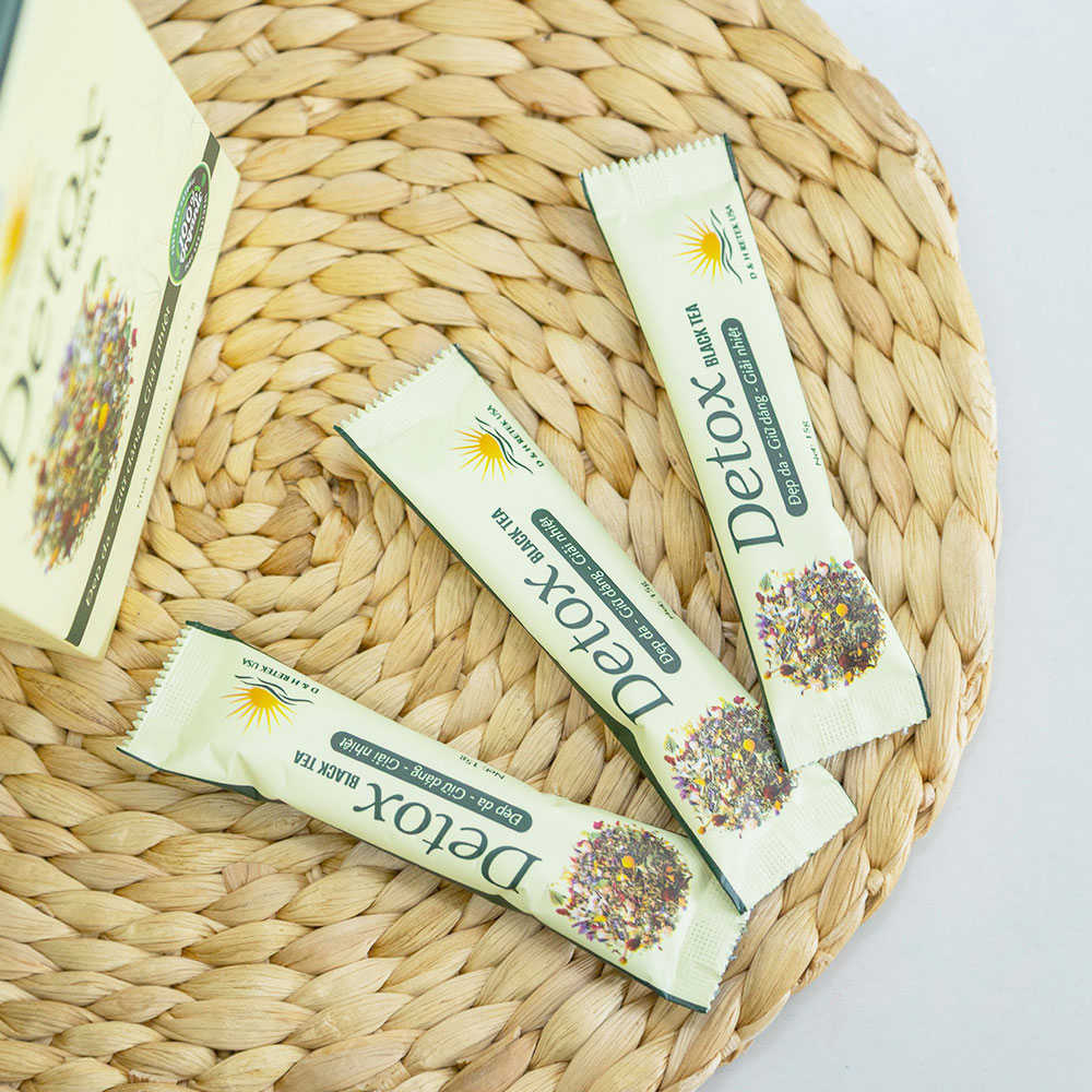 Thành Phần:  + Bột hạt cassia + Bột hạt gai dầu + Bột trà đen + Chất xơ + Bột lá sen + Đường không năng lượng Trà Detox Black Tea : đẹp da – giữ dáng – giải nhiệt